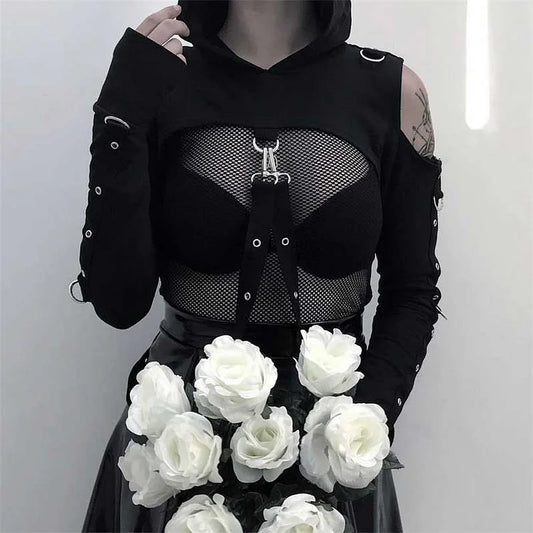 Gothic Hollow Cut Off Shoulder Hoodie